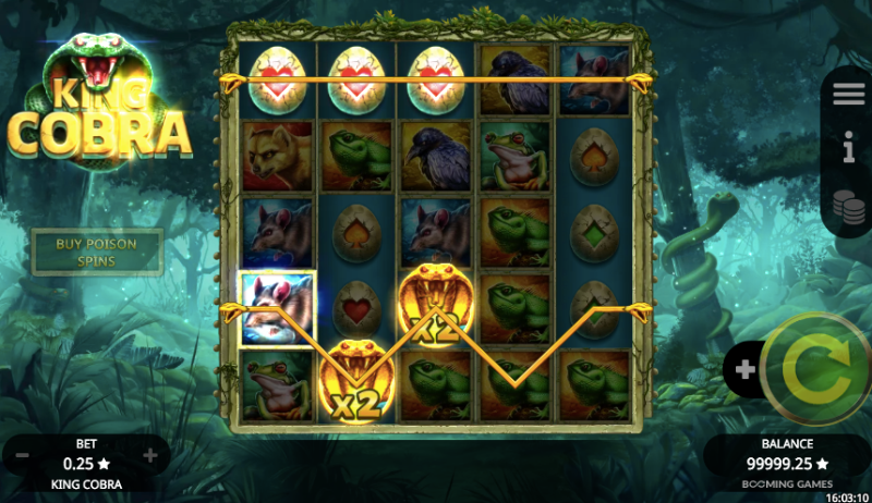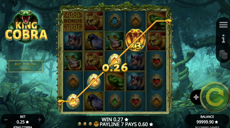 Booming Games has rated the King Cobra slot as having high volatility levels, with a good hit frequency of 24.19%. The game’s RTP is 95.50%. If you choose not to buy it for 90x the selected bet, you can expect the Poison Spins main event to occur every 268 rounds.