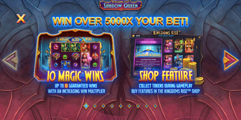 Kingdoms Rise: Shadow Queen belongs to the Kingdoms Rise series and has a feature called Kingdoms Rise Shop. When you spin the reels, you collect gold tokens which you can use in the shop. The shop allows you to purchase features from other Kingdoms Rise slots using your tokens.