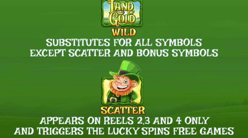 The Land of Gold slot has a total of 11 regular symbols such as pots of gold, rainbows, clovers, horseshoes, golden harps, hearts, diamonds, spades, and clubs. Additionally, there are special symbols including the bonus mushroom that triggers the Golden Coins Bonus, the wild ‘Land of Gold’ symbol that replaces all except bonus and scatters, and the leprechaun scatter symbol that activates the free spins feature in this online slot game.