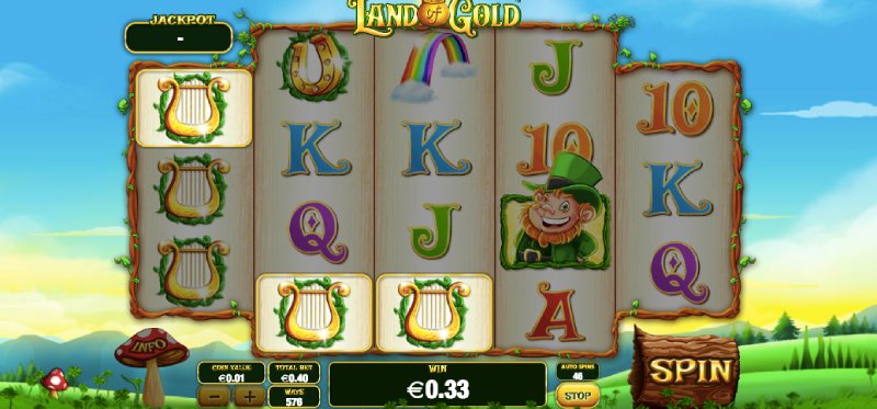 Land of Gold has an appealing theme that revolves around a fortunate Leprechaun and his escapades. The slot’s symbols include the Leprechaun himself, as well as recognizable items such as a clover, a pot of gold, and a rainbow. The game features a good amount of animation, such as when getting three leprechaun scatters activates the free spins round, and the leprechaun flips his lucky gold coin.