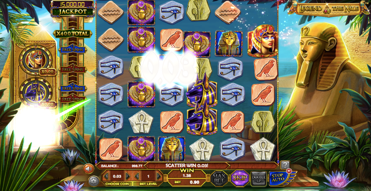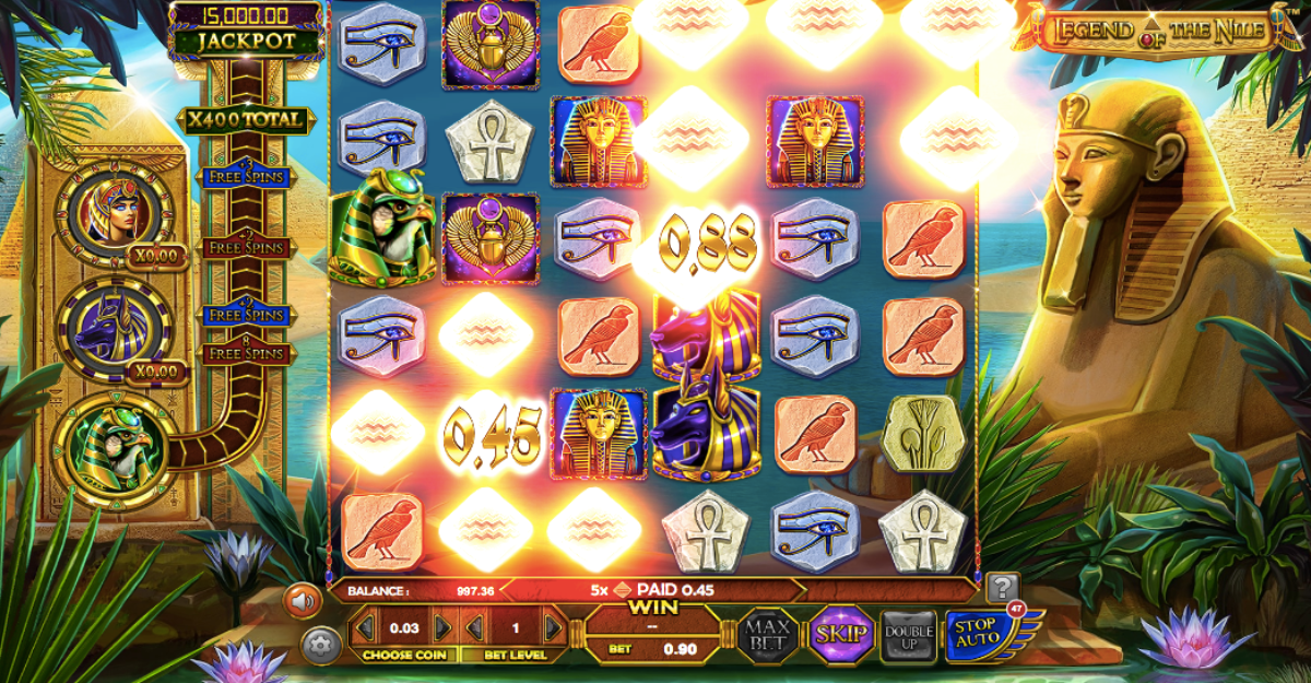 The good things about playing Legend of the Nile is its features and three-dimensional graphics. This video slot machine offers a unique six by six grid plus a progressive jackpot! Above all, we feel that BetSoft did a great job creating this game. As a result, it is fun to play for real money and has great wins. Some more features we like are the high return to player (RTG) and the low to medium volatility. In contrast, we feel the machine runs out of steam over long sessions. Overall, we give this online slot machine five out of five stars!