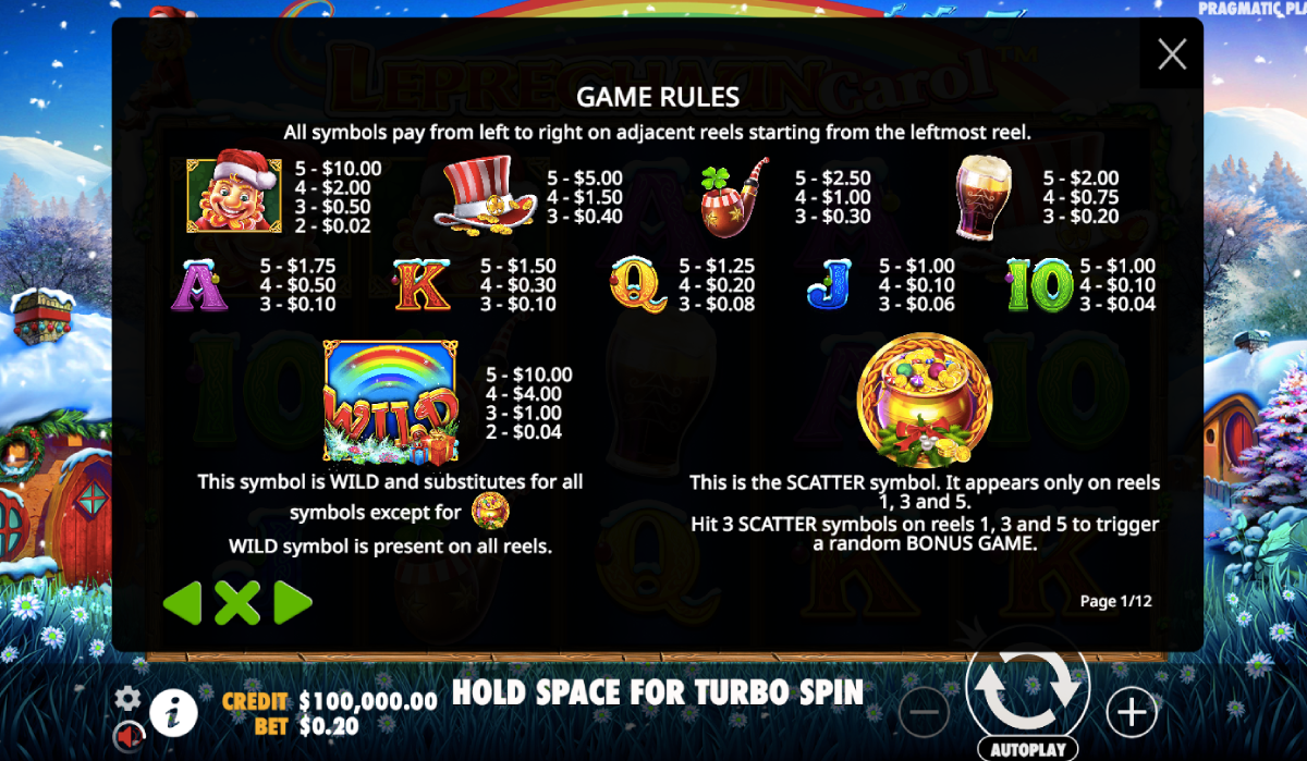 Leprechaun Carol has a basic layout and offers real money gamblers five reel and twenty pay lines to bet on. However, this game is pretty unique, so get ready. You will see green pastures plus the small leprechaun house with snow behind the reels. Overall, it seems like Pragmatic Play takes some icons from Leprechaun Song but puts an interesting spin on them. When you start to spin the wheels, you will see the main leprechaun character. However, it appears he is wearing a Santa Hat, instead of his headgear from the other title.