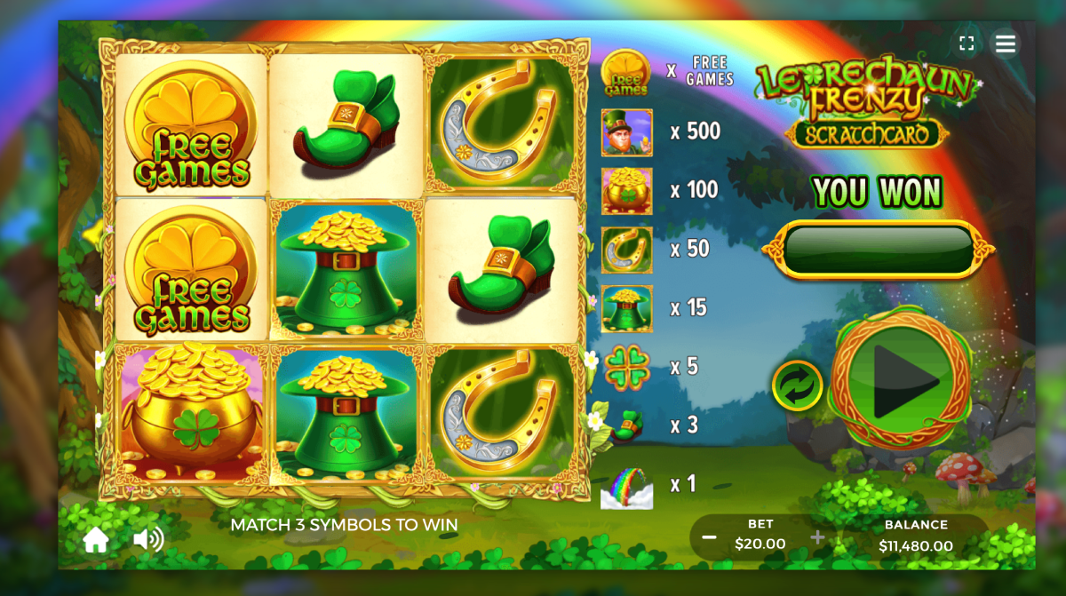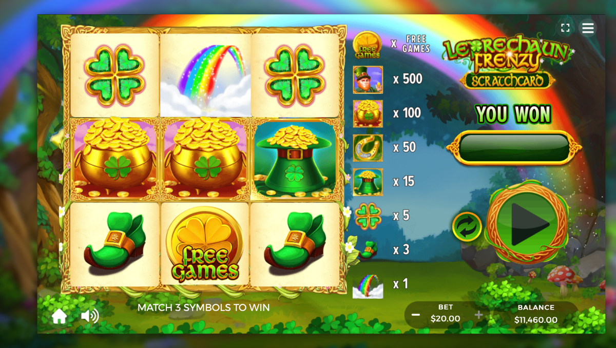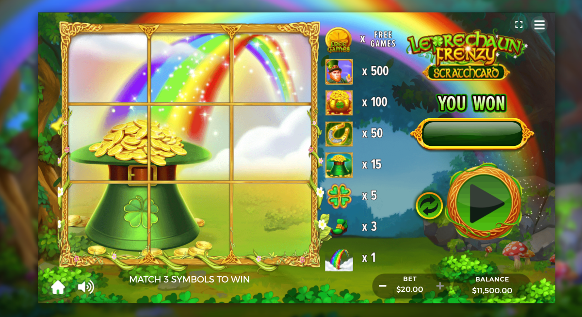The directions are straightforward: in this 3×3 scratch card game with an Irish theme, land three of the same symbols on the grid to earn money based on the symbol’s pay table value.The Leprechaun is the most lucrative symbol on the reels, with a payout of 500 times your stake.