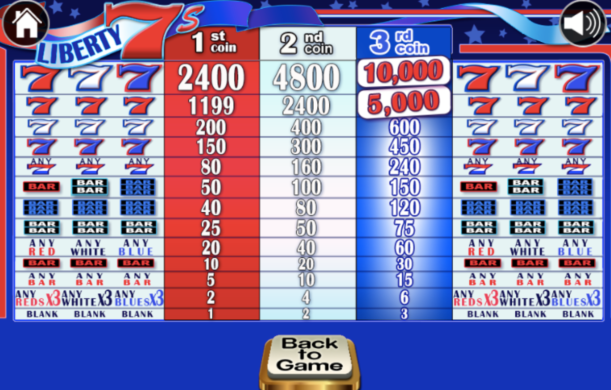 Win the 10,000 fixed coin jackpot by scoring three triple sevens in the wheels betting three coins.Win 4,800 If you are betting two coins and land 3 triple 7s, and score 2,400 coins wagering one coin hitting three red white and blue triple 7s.