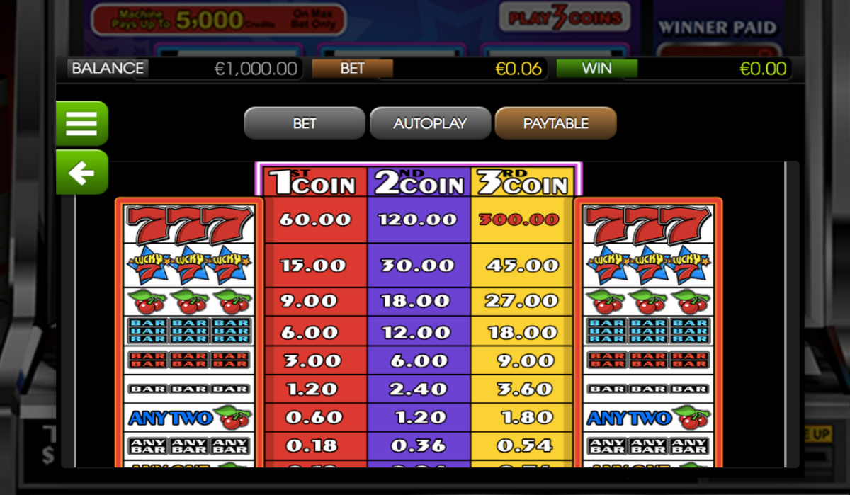 The oin values for Lucky 7 are from 0.02 up to 1.00. 5,000 coins is the standard jackpot. It pays out when you land at least 3 Red 7s symbols on all the reels while playing the maximum bet. Remember, you have to place the maximum bet (max bet) to trigger the jackpots.