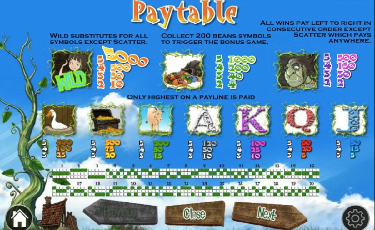 Lucky Beans symbols are all indicative of the “The Story of Jack Spriggins as well as Enchanted Bean” and “The History of Jack and the Bean-Stalk” theme. Have fun watching the traditional poker playing card symbols on the wheels. You will see everything from the nine, the Jack, the 10, the Queen, the Ace and the King with excellent graphics.