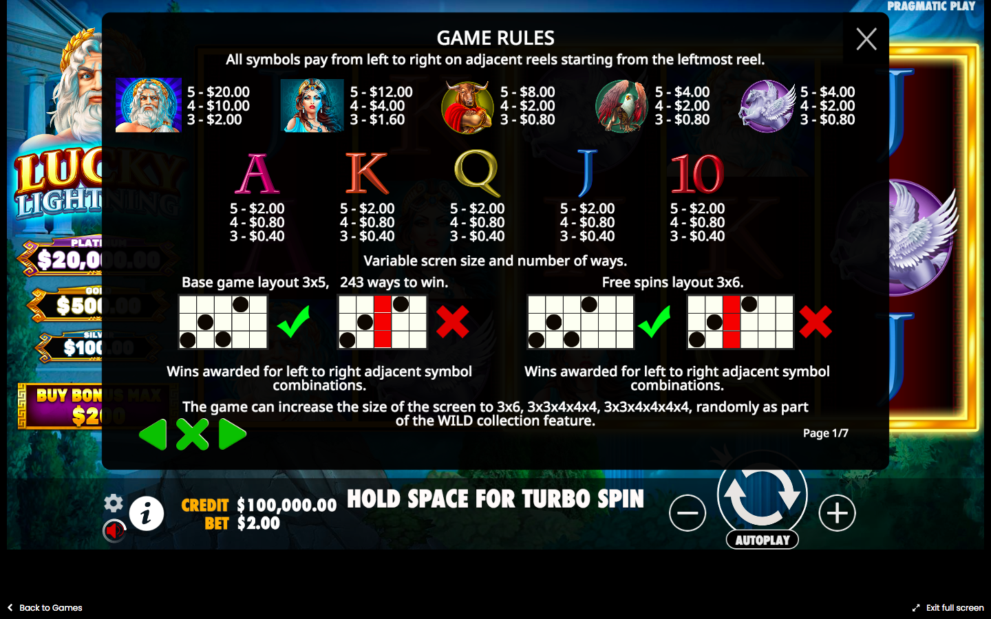 Lucky Lightning features 5 reels, 3 rows and 243 ways to win.This slot machine has the average 5 reel layout. To win, players need to land 3, 4 or 5 matching symbols in a row (or 6 if possible) on adjoining reels, starting from reel 1.