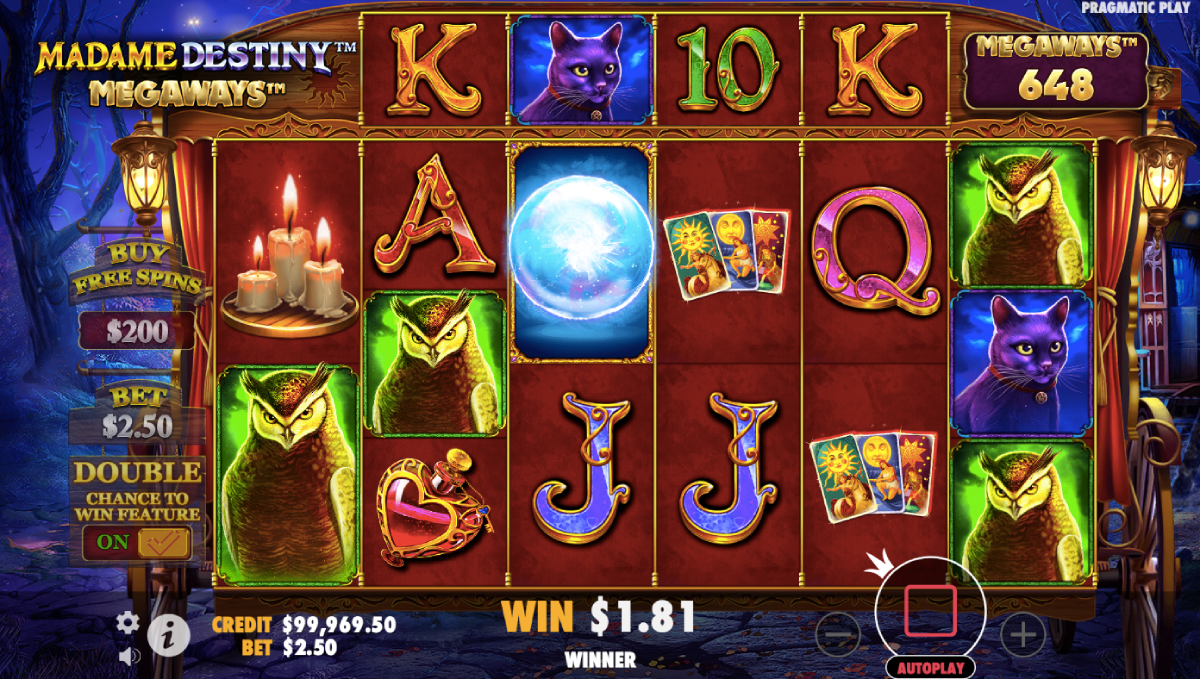 Madame Destiny Megaways features a gloomy and ominous tone, with a grid set on the wooden gypsy caravan, set against the background of the grim and scary forest path. The high standard of graphic design is something we came to expect from Pragmatic play and this game is no different. The dark music theme perfectly complements the atmosphere of this game. The symbols include most of the icons you would expect in the story of a fortune-teller, such as tarot cards, a crystal ball, an owl, a cat, and the main character, Madame Destiny herself.
