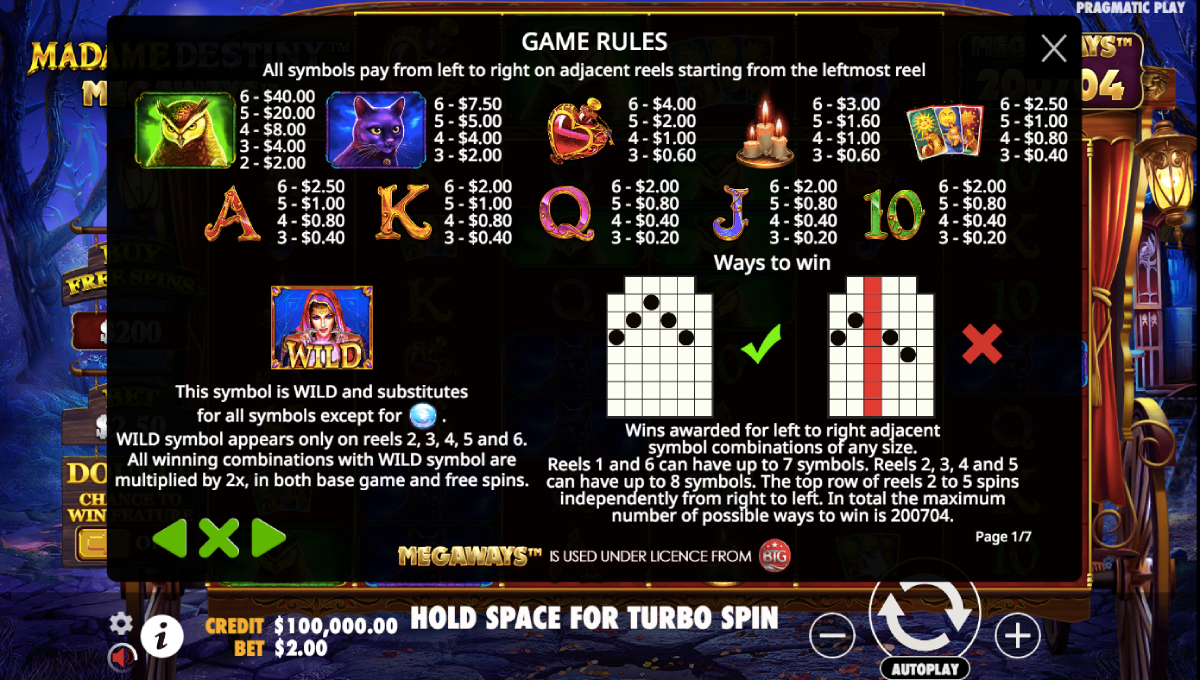The bonus rounds with so much multiplying action will make many players glad that the Madame Destiny Megaways has a Bonus Buy feature where you can go straight to bonus rounds with the cost of 100x the bet. Also, players can use the Ante Bet option, which increases the stake by 25%, but, at the same time, doubles the chances for getting to the bonus rounds by adding more scatters to the grid.