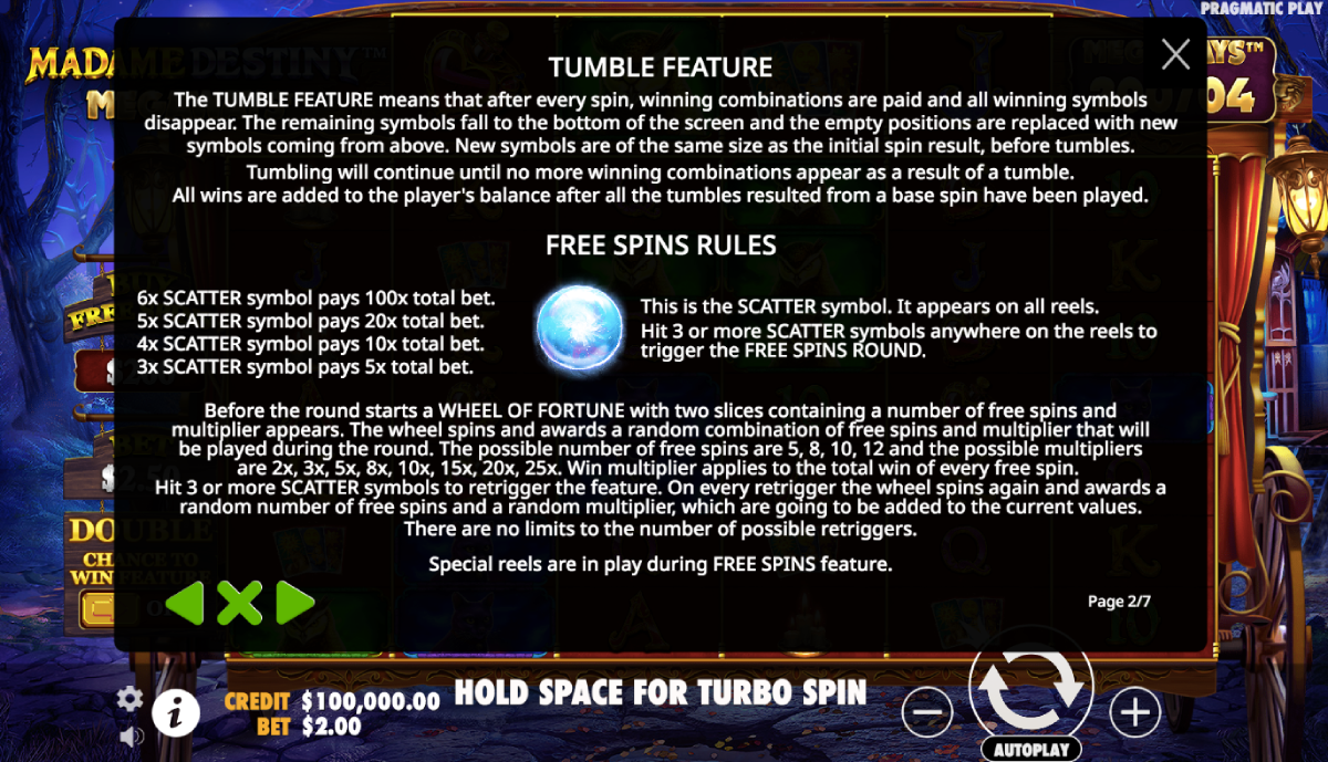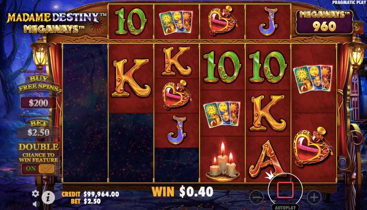 Madame Destiny Megaways slot machine features a cascade feature which is pretty common in this type of game. The cascading (or tumbling) mechanism means that every time you land the winning combination, those symbols vanish, with empty spaces on the reels being filled with another set of icons dropping down. This continues as long as there are winning combinations.