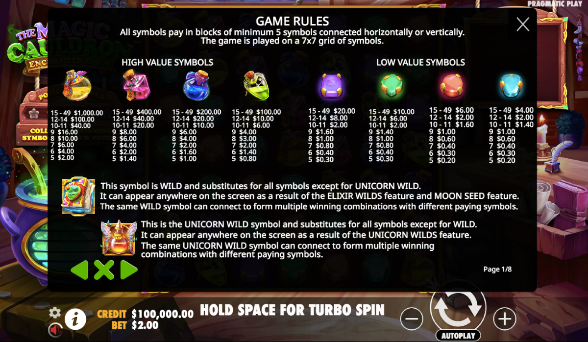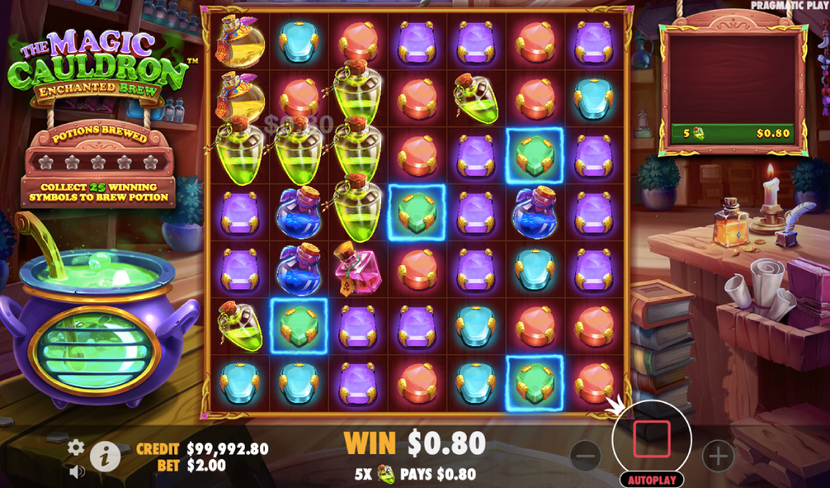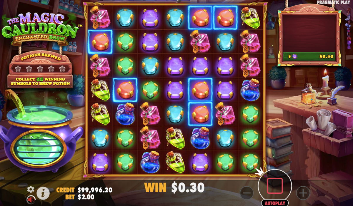 Magic Cauldron: Enchanted Brew is played on a 7×7 grid. It uses a Cluster Pays mechanic in which 3-of-a-kind symbols can substitute for any other symbol in order to complete winning combinations.If you get 5 matching symbols or wilds, then you win.