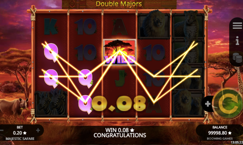 Majestic Safari by Booming Games has a high level of volatility and offers a 95.99% RTP (Return to Player).