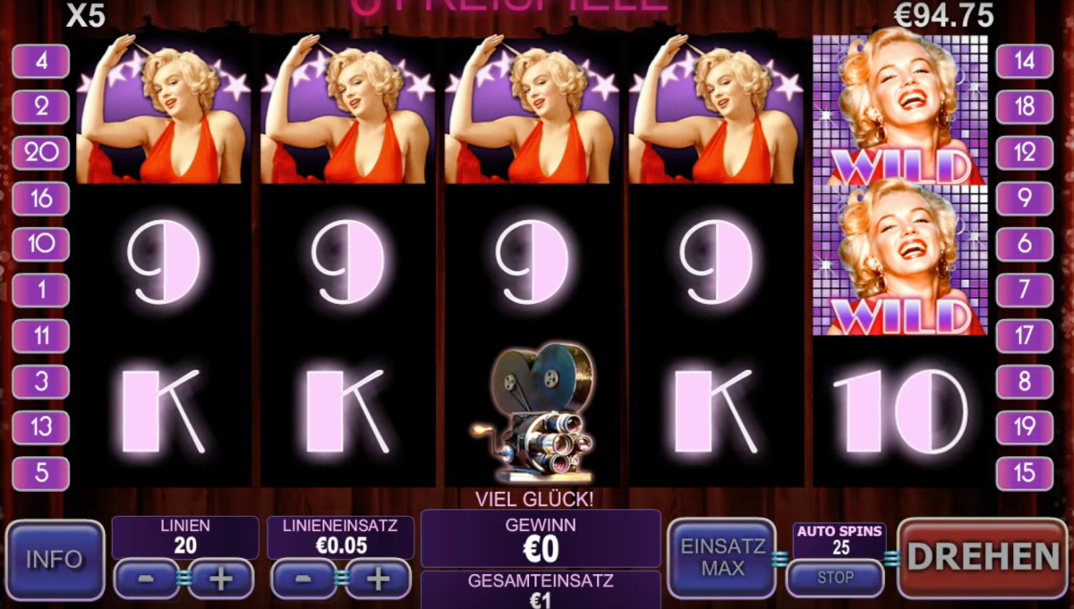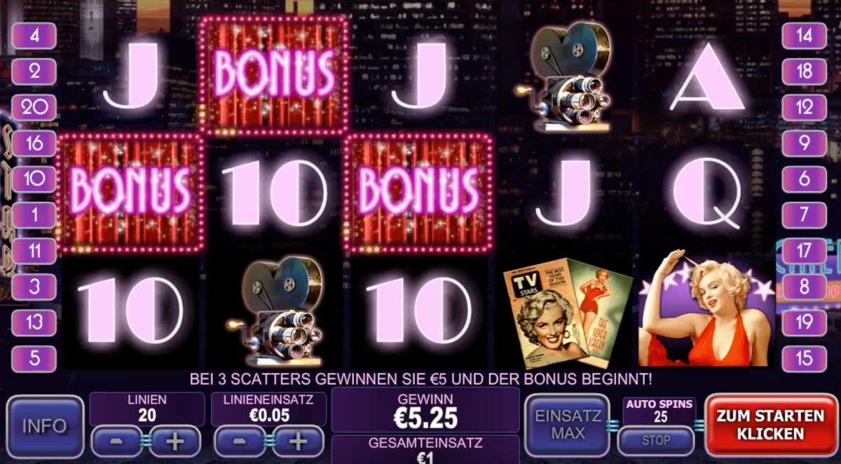 The Marilyn Monroe free slot offers a single bonus round, but it is still a profitable game. If you land three or more scatter symbols on any reels, you will receive 10 free games with 2x multiplier. This game has 20 pay lines and includes high-paying symbols such as a Walk of Fame star and a movie camera, as well as iconic poses of Marilyn Monroe. The game’s logo character is the wild symbol and the scatter symbol is the neon Marilyn Monroe logo.