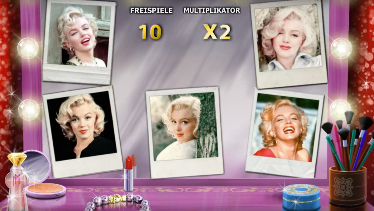 To activate the Backstage feature in Marilyn Monroe, all you need is three or more of the game’s logo symbols anywhere on the reels. Once the feature is triggered, you’ll receive 10 additional spins with a 2x multiplier while in the actress’ dressing room.