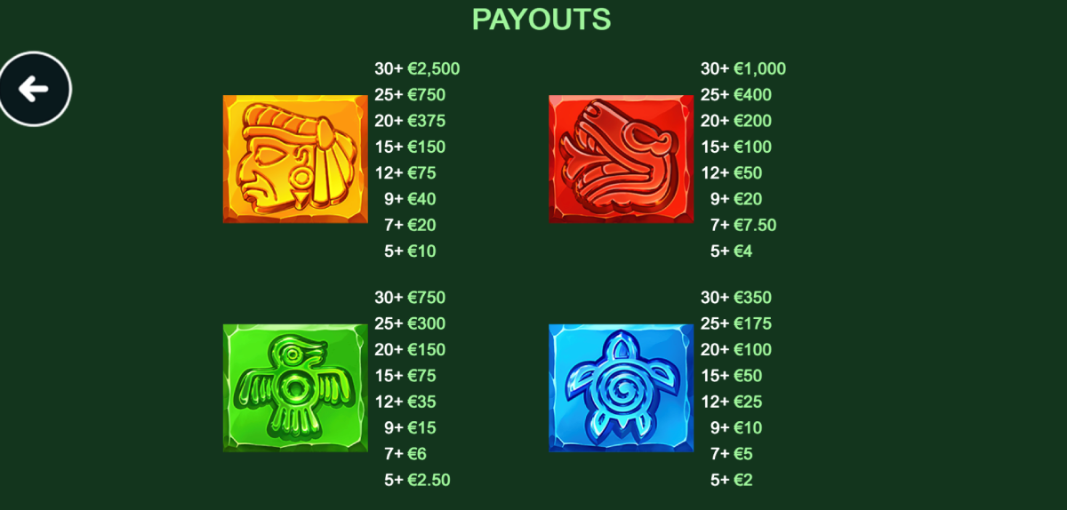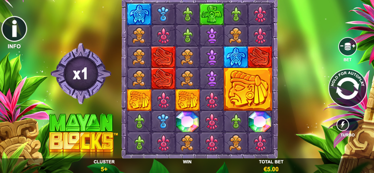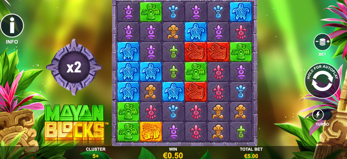 Mayan Blocks uses a ‘cluster pay’ system where players are rewarded when they have at least 5 matching blocks in a cluster. The symbols are counted when they touch vertically or horizontally, making it easy to achieve. The size of your win is influenced by the number of blocks in the cluster and your bet amount.