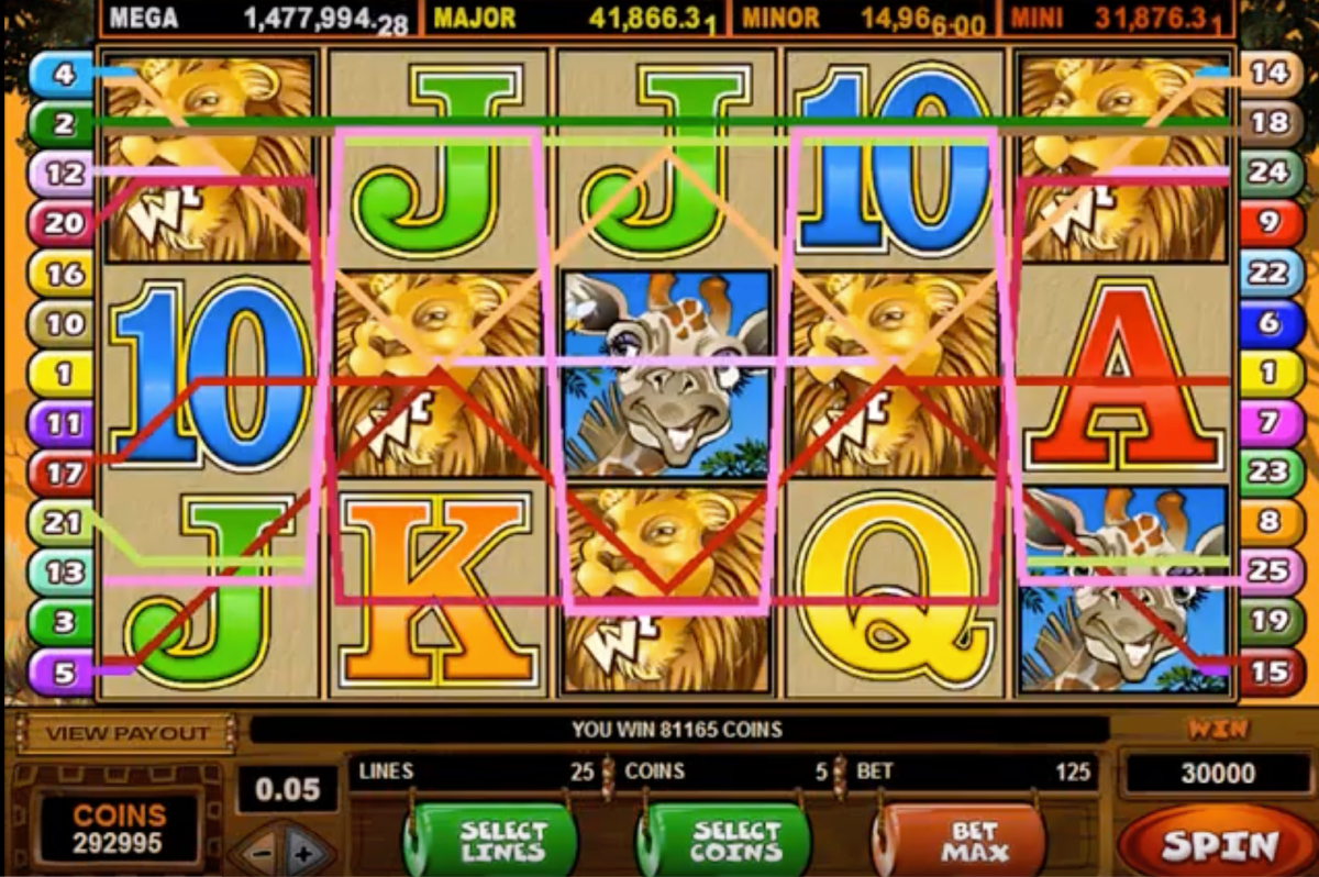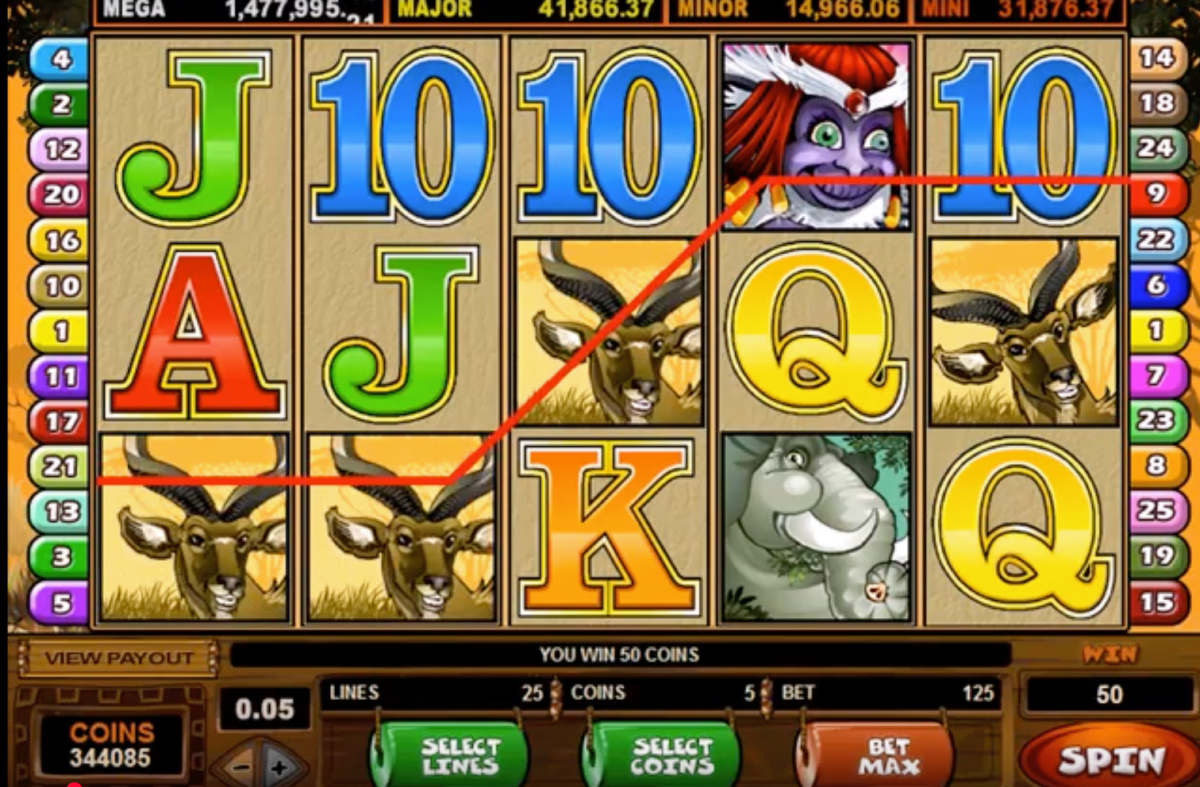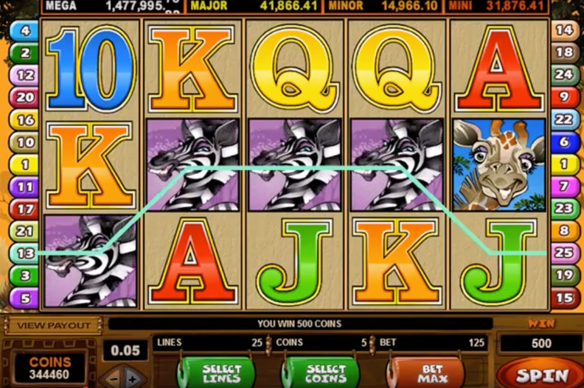 Prizes above are denominated in coins. If you’re playing all 25 paylines, divide the above prizes by 25 to get the total win according to your total bet. For example, if you played 25 paylines for $0.25 and got 4 Giraffes, you’d win 125 coins, which is 125 / 25 = 5x your total bet, which is 5 x $0.25 = $1.25.