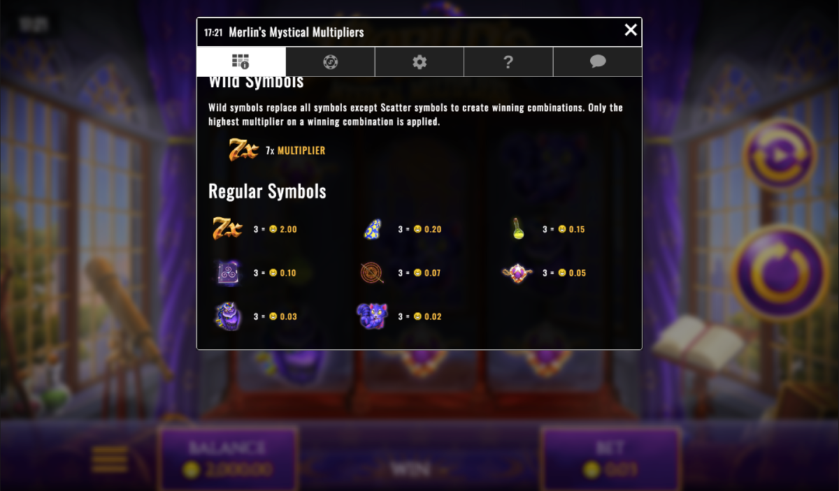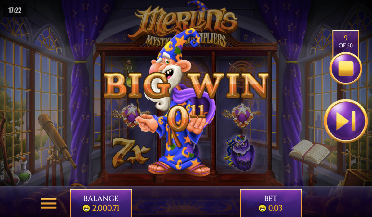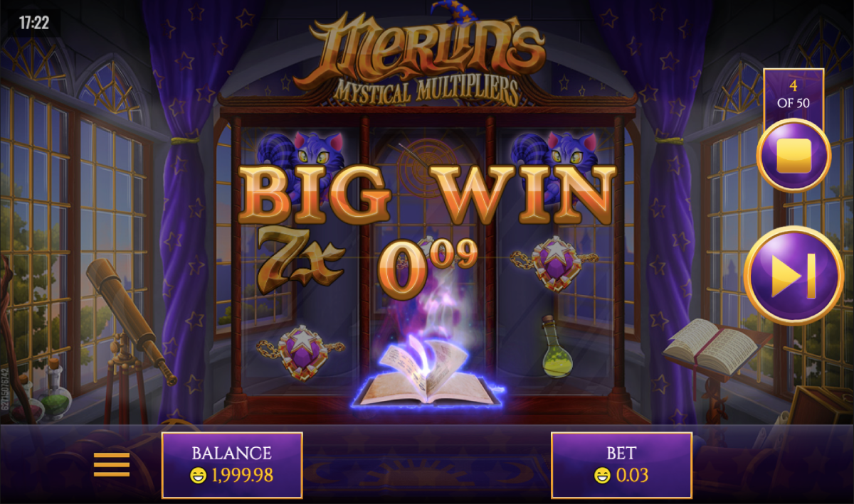 As most slot players know, five-pay-line games don’t usually offer super jackpots. However, as the name of this game suggests, Merlin’s Mystical Multipliers is all about, well, the multipliers! Hit those and your rewards can be substantial. You can stake up to 3 coins per payline, meaning that your maximum stake at $5 per coin would be $75. You get the best payouts after activating the multipliers. Full details of potential payouts can be found in the paytable located on the screen near the reel-grid.