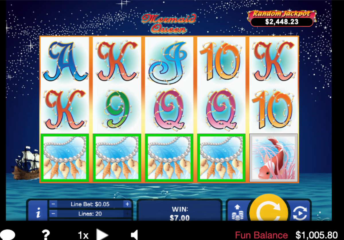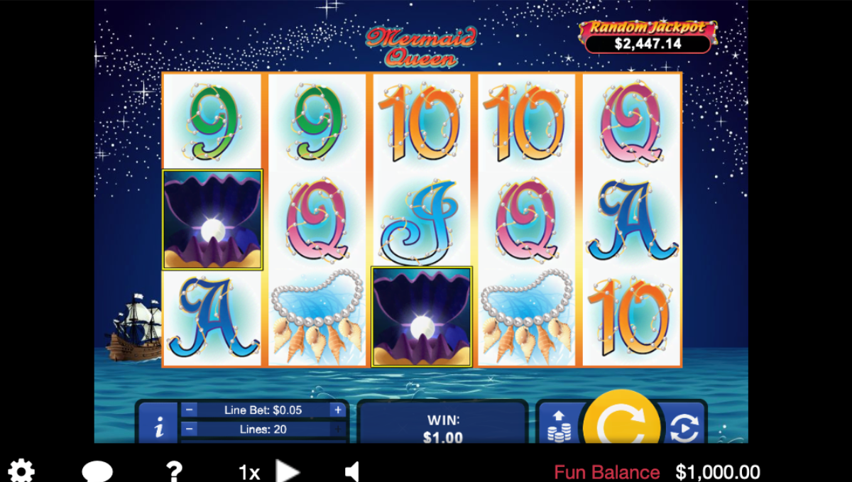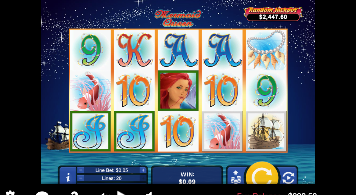 Mermaid Queen Slots is a most popular RTG video slot game. Mermaid Queen has five reels, 20 pay lines and features a wild symbol, a multiplier, free spins, scatter wins, bonus games, and a progressive slots jackpot.