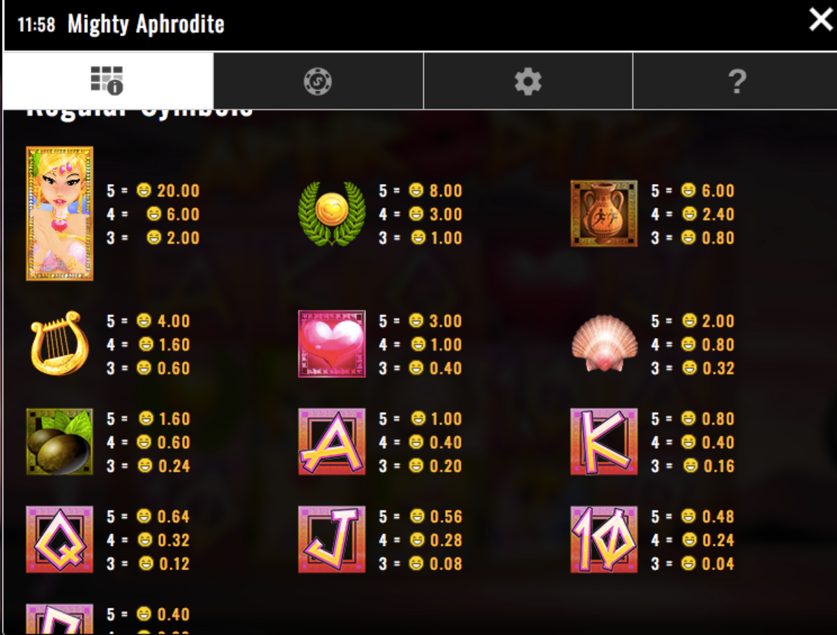When you see the Aphrodite icon, she replaces all of the other symbols as she is the stacked wildcard. Furthermore, if you land five wild Aphrodite’s on the reels, you are in store for a nice win. Also, she gives you extra chances to score winning combinations and much more simple to hit multi-line payouts.
