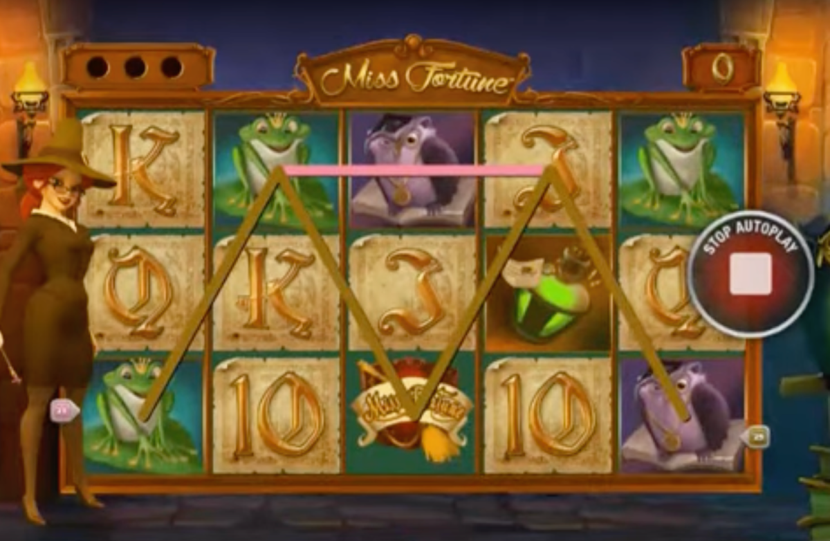 The background of the game features candles, schoolbooks, an owl, and potion bottles, and a beautiful Miss Fortune appears on the left side of the reels. The symbols on the reels include playing cards (A, K, Q, J, and 10), potion bottles, sand timers, frogs, owls, and Miss Fortune. If you get five Miss Fortune symbols in a payline, you win 20 times your stake.
