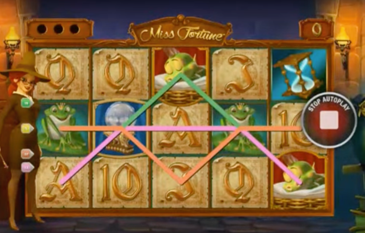 In order to begin playing, please select the size of your bet per pay line and indicate the number of pay lines you wish to activate. The minimum bet per pay line is 0.01 GBP while the maximum is 50 GBP. Your goal is to land successful combinations in order to win.The symbols 10, J, Q, K, and A are considered low-value, and you can win a maximum of 125 times your bet if you land five of them. On the other hand, the high-value symbols are Miss Fortune, an owl, a frog, a potion, and an hourglass, which can pay up to 500 times your bet on a pay line.