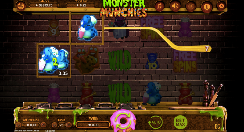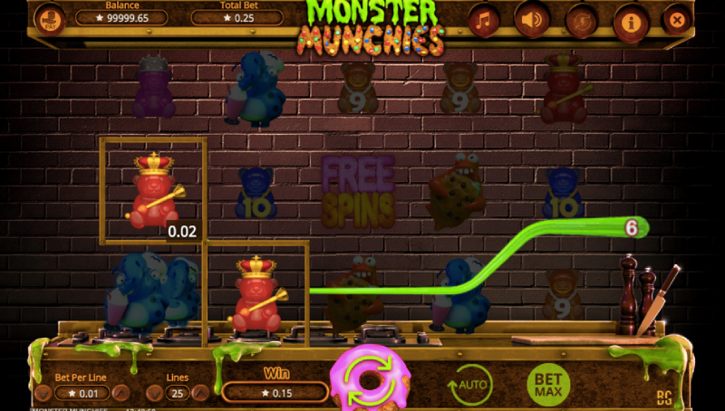 In Monster Munchies, the minimum spin bet is 0.25, and the line bet is 0.01. If you increase the line bet to the maximum amount of 2.00, the spin bet will be 50.00.
