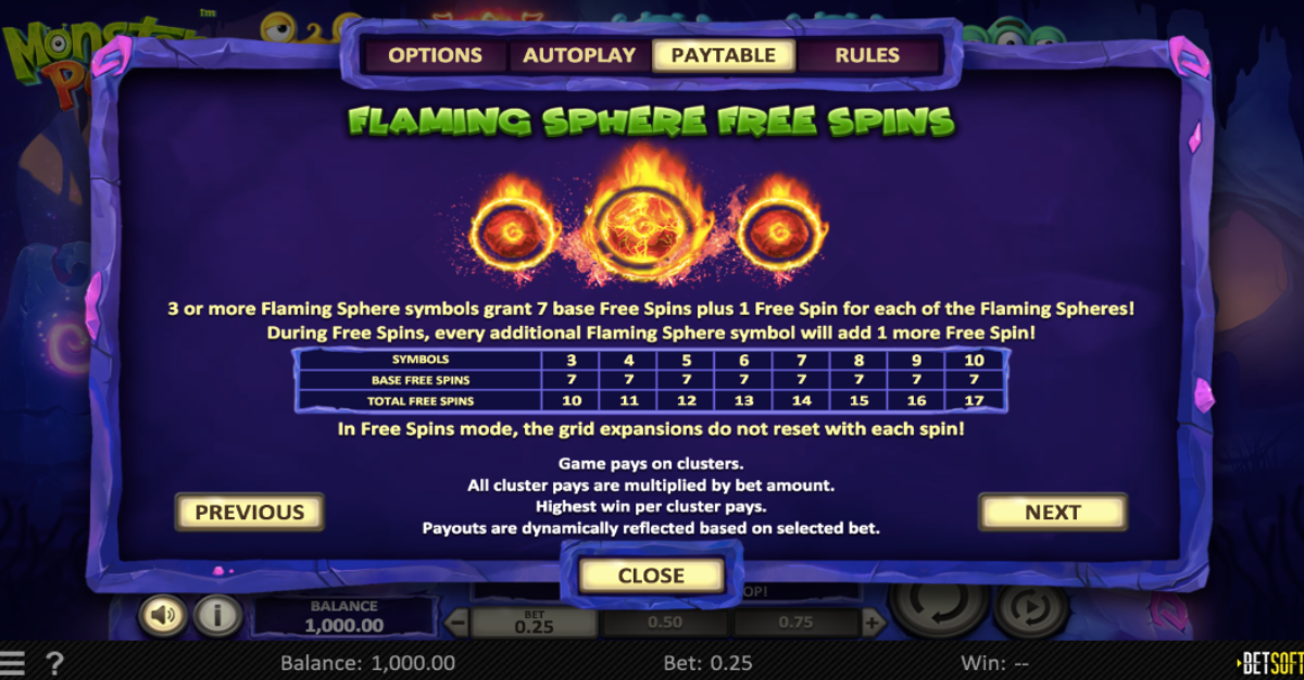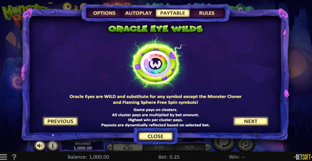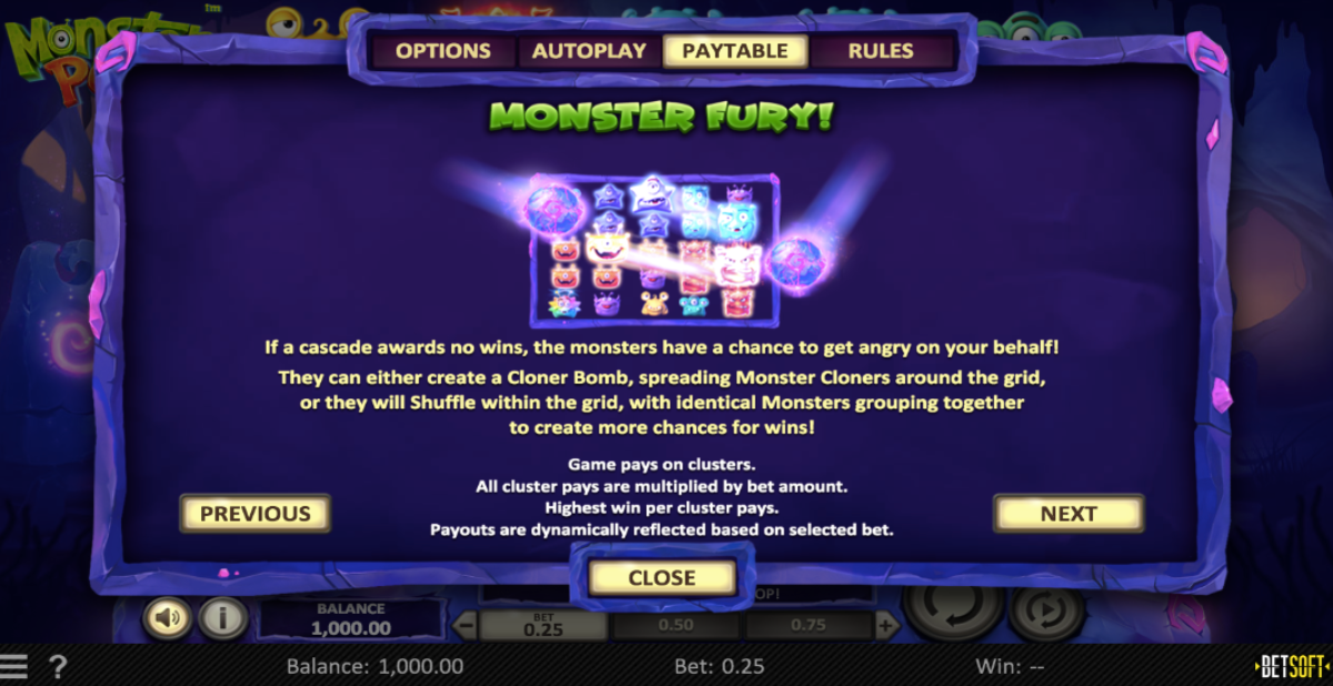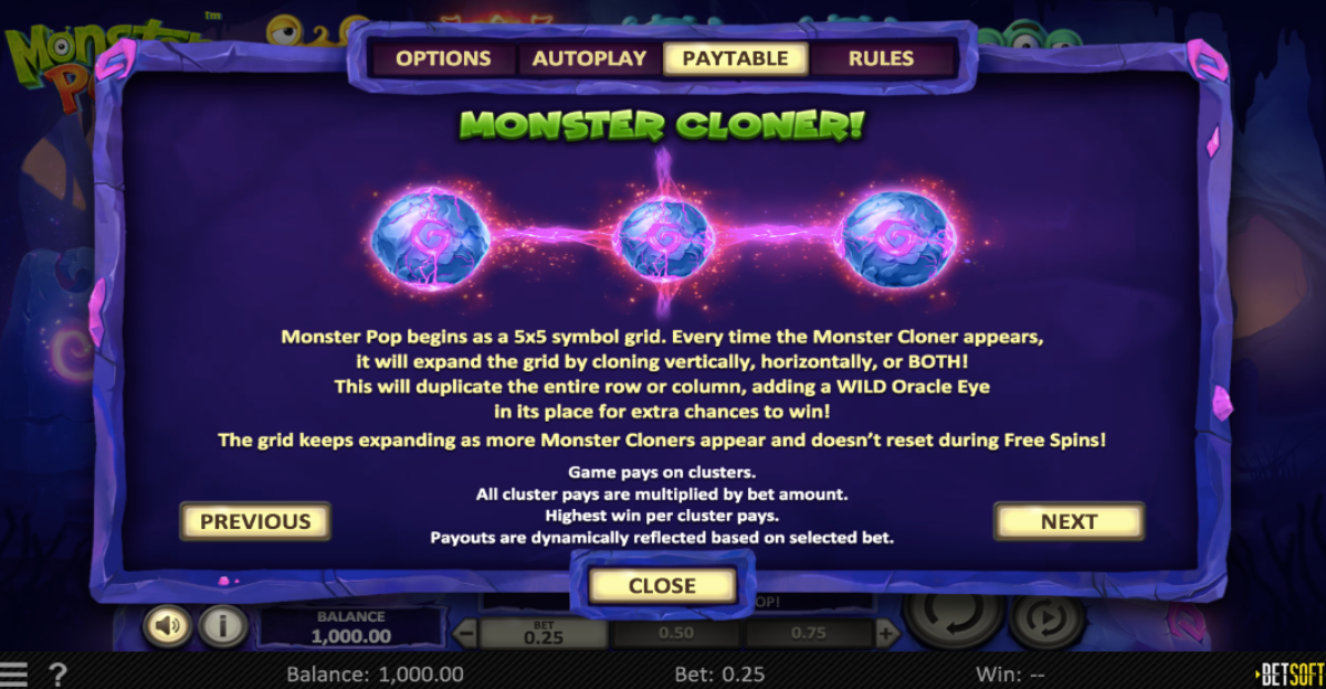 For instance, you can expand your grid to the point where you burst through the grid. As a result, you receive big wins. As you spin the reels on the Monster Pop slot machine, you will notice this Las Vegas-style slot machine is fast-paced. Enjoy this exciting betting action as you embark on a monster adventure by landing the Monster Cloner Symbols.Be sure to utilize our slot machine strategy.