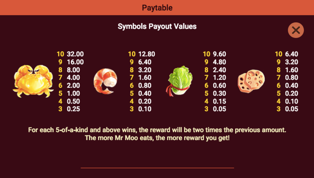 A perfect slot for everyone who enjoys an all-you-can-eat buffet now and then, Moodie Foodie presents you with the challenge of feeding the ever so hungry cartoon bull, Mister Moo. After being refused service at every restaurant in town, poor Mr. Moo is heading to a new spot in town to satisfy his appetite.