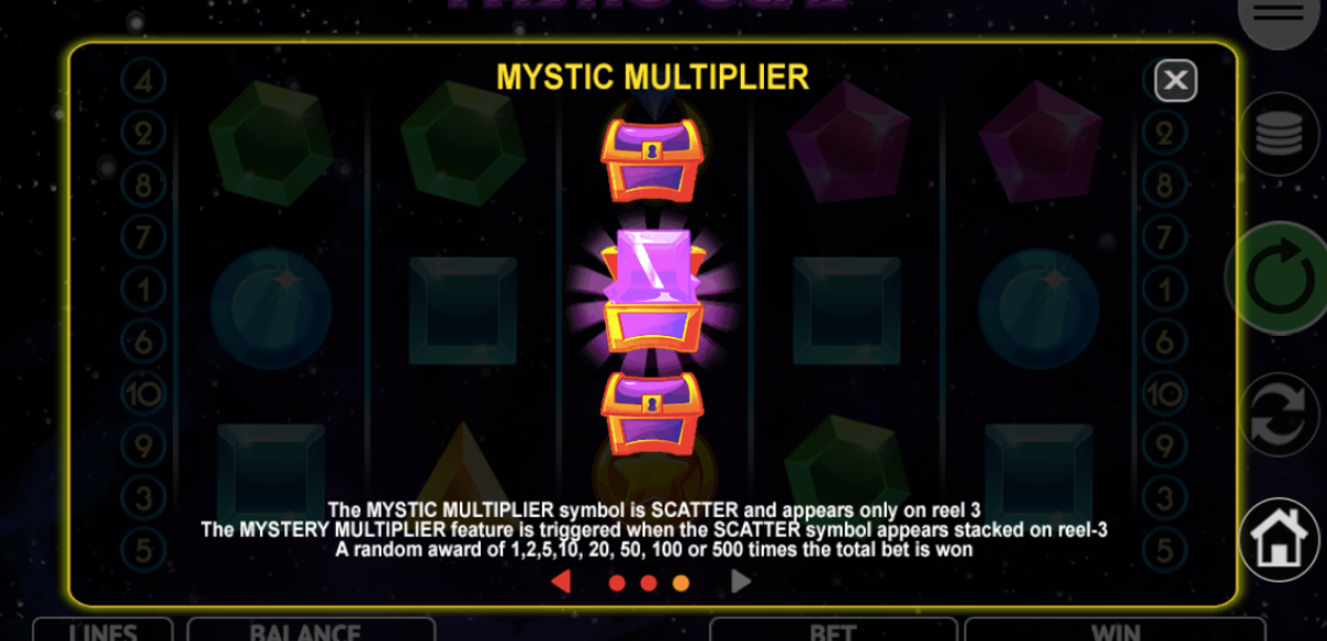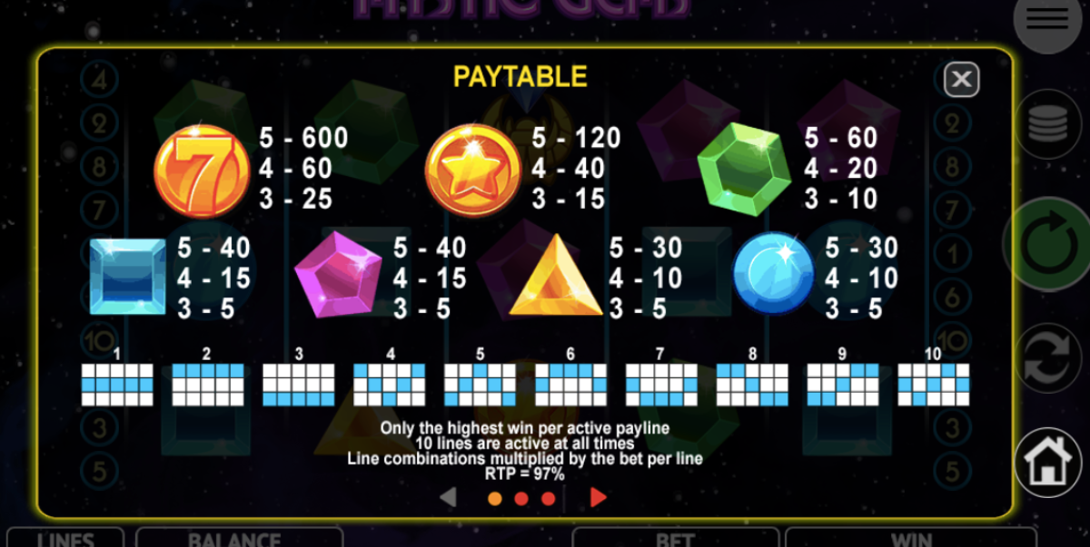 Mystic Gems is a 5-reel, 25-payline slot machine. It has 96% RTP and that makes it a game you want to play.The graphics in this game are very nice. You can see the beauty of different gemstones.