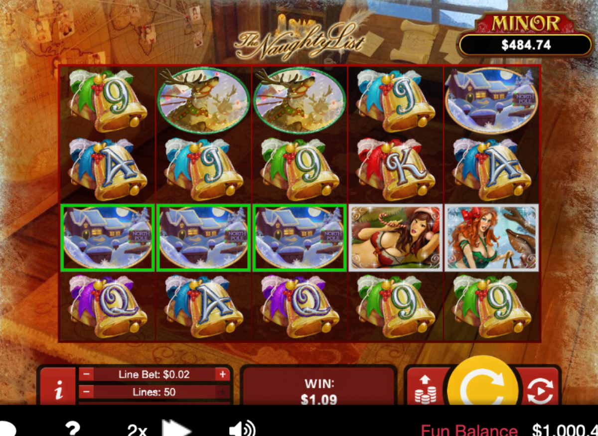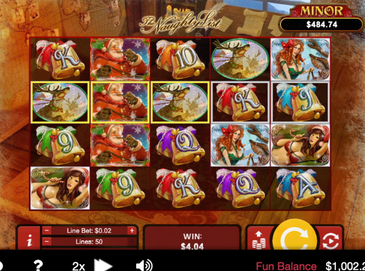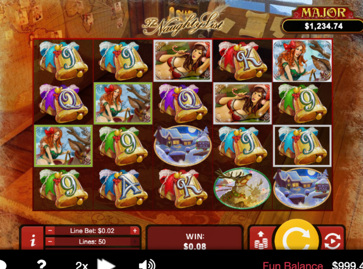 The Naughty List is a five reel, 50 pay line holiday / Christmas themed video slot game that is powered by Realtime Gaming (RTG) software that is similar to Naughty Or Nice and Santastic. The Naughty List features a minor progressive jackpot, a major progressive jackpot, impressive graphics, and wild symbols, scatter wins, free spins, and bonus games.