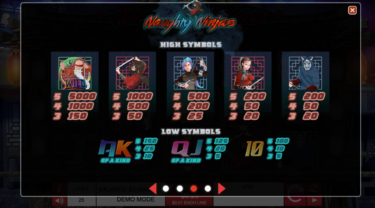The minimum and maximum total amounts are from $0.01 to $10.00 per line on this Martial arts and Asian themed slot machine. A maximum bet of $250 per spin. Step into the arena and discover how the ninjas wage war on this five reel slot machine; all of the paying symbols except the scatter symbol pays out from left to right.