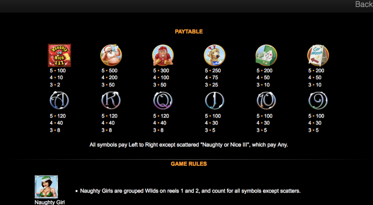 Indeed, Naughty or Nice III, pays both ways. Ultimately, this means you can win from the left to the right and the right to the left. The Naughty and The Nice Girls are ground wilds and they appear on different reels. First of all, if you choose the Naughty girl, she will appear on the first and second wheel. If you select the nice girl, you will find her on the fourth and fifth reel. Score either of these wilds and they will replace all of the symbols to help form a winning combination.