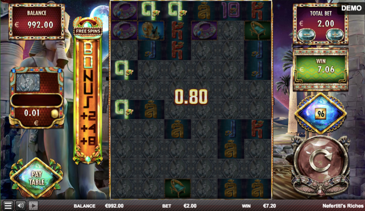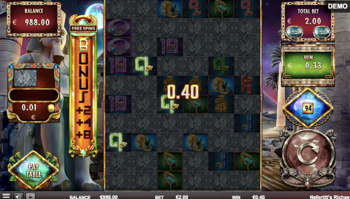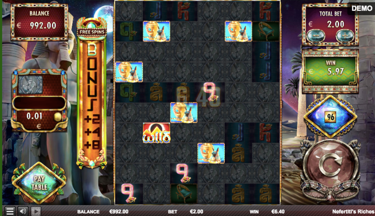 Whenever you land a Nefertiti symbol it will be noted in a meter to the side of the screen. When the meter is full the Nefertiti Minigame will be triggered. It takes place on a 5×3 grid that can grow to six rows if you land certain special symbols. During this game you can win multipliers, more spins and additional reels. It can all add to some pretty fantastic wins. The best part is, the game will continue until you have either filled all the available positions with symbols or run out of spins.