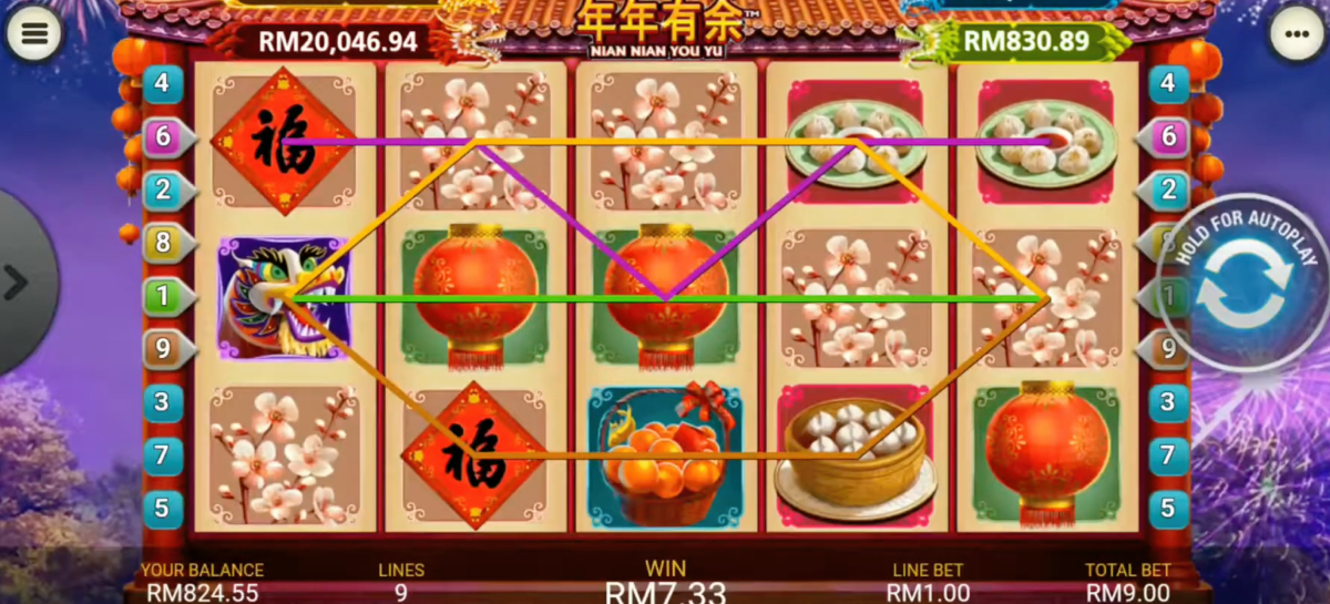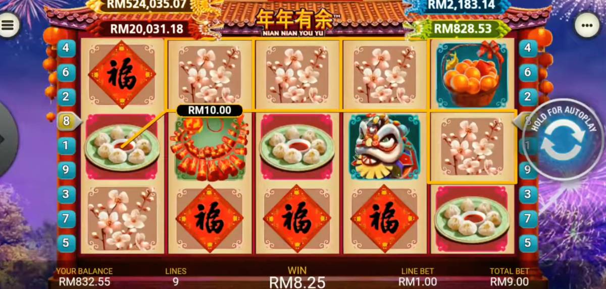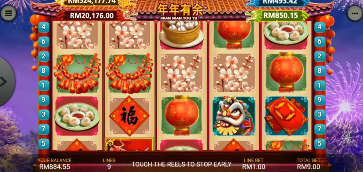 The “wild” symbol in this game is portrayed as a fish and can substitute for any other symbol except the scatter symbol. The scatter symbol is represented by Chinese characters that spell “Nian Nian You Yu.” Landing scatter symbols on active paylines is not necessary to increase your winnings. Finding two or more scatter symbols can increase your overall winnings.