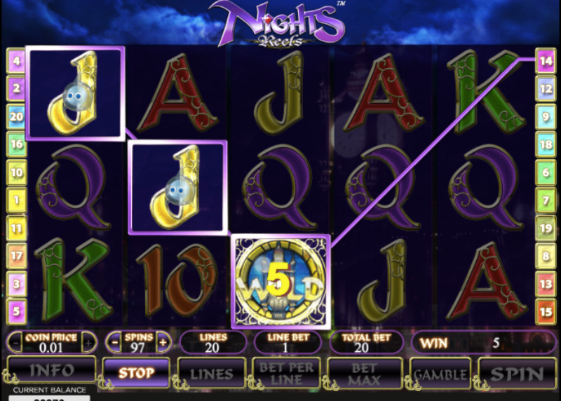 To determine the value of one in-game currency unit in credits in Nights Reels, use the denomination procedure. To customize this setting, click on the Click to Change button located in the left bottom corner of the interface. Please note that the value should be between one and ten credits.You can use the Lines button to activate 1 to 20 payoff lines in the game. To set the bet per line, go to Nights Reels and follow these steps, keeping in mind that the size of the bet is measured in in-game currency.