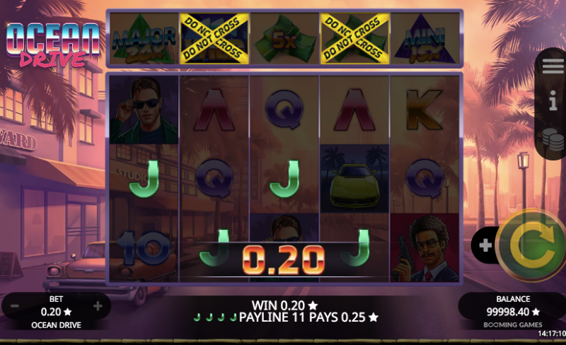 The type of slot game that we enjoy features a free spins bonus. In Ocean Drive, you can trigger free spins by getting a scatter symbol that resembles a police car.