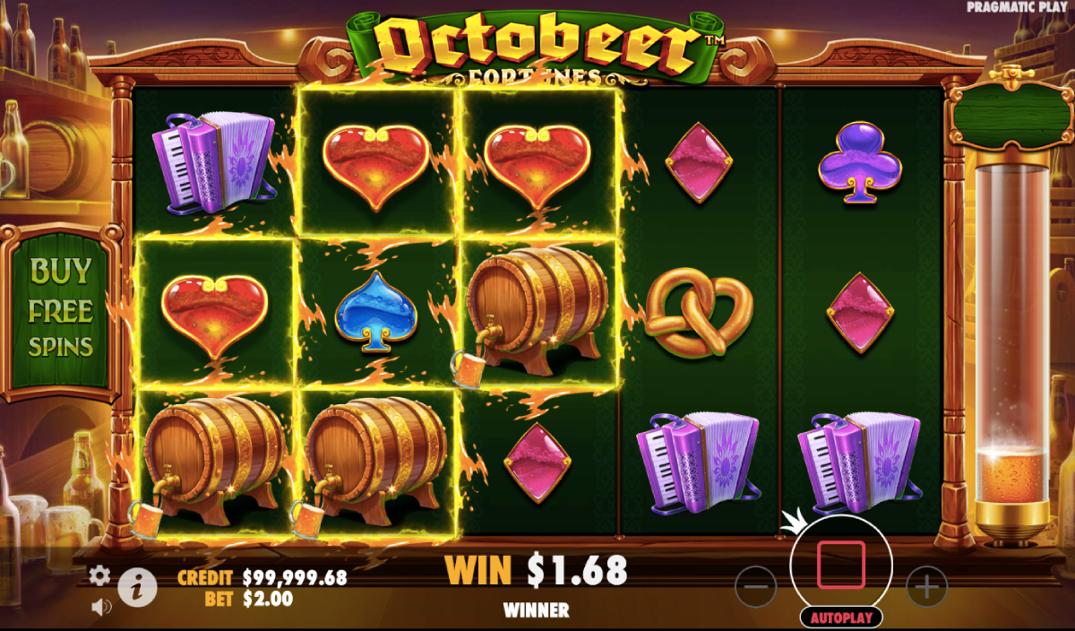 The 5×3 reel Octobeer Fortunes slot from Pragmatic Play has 20 paylines and is full of beerfest volatility.Barmaid Wilds symbols in the base game not only collect beer money prizes, but also accumulate the bonus round’s beer tower prize.Collect the current prize with each wild that lands during the feature, and you can win up to 4,500x your stake.