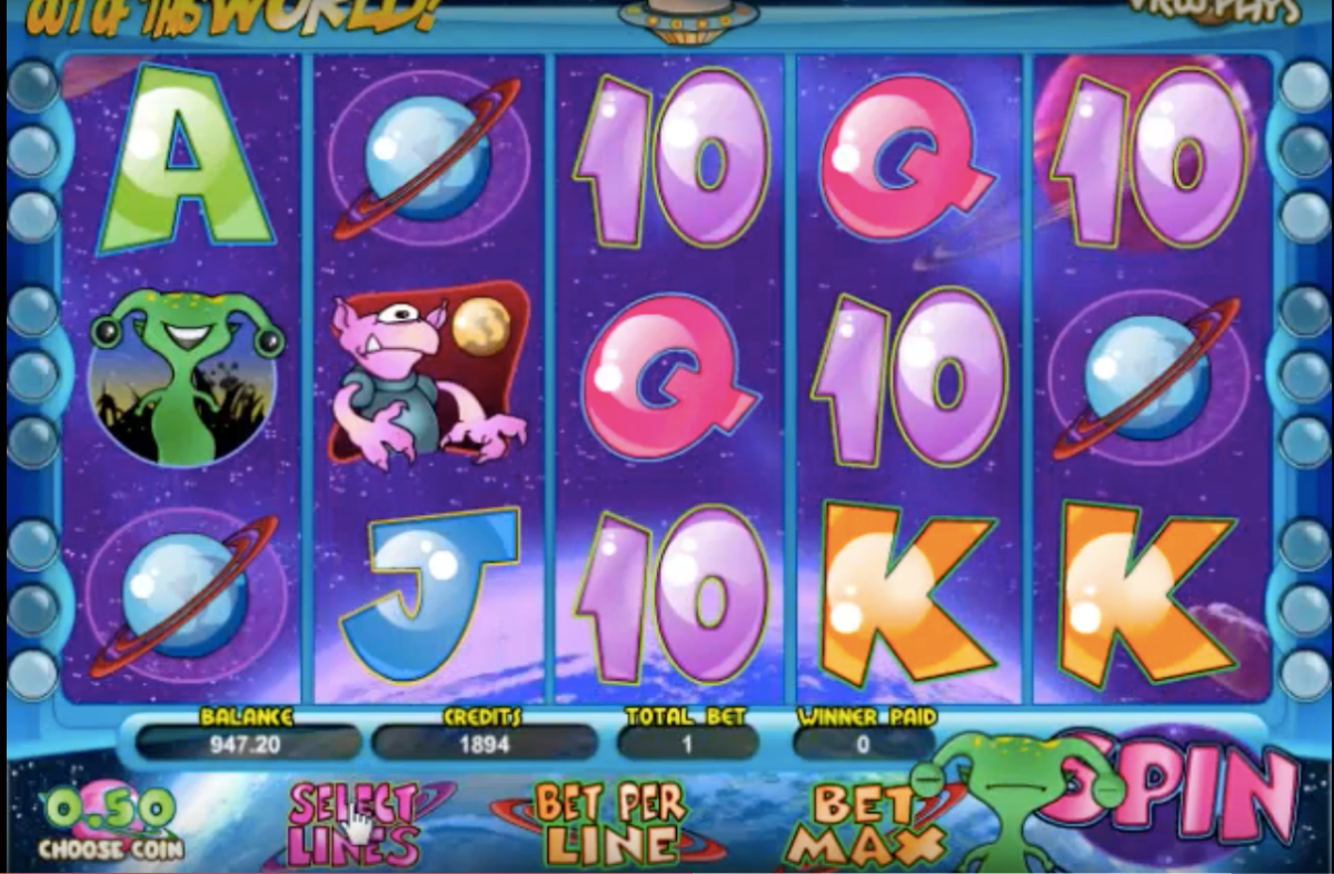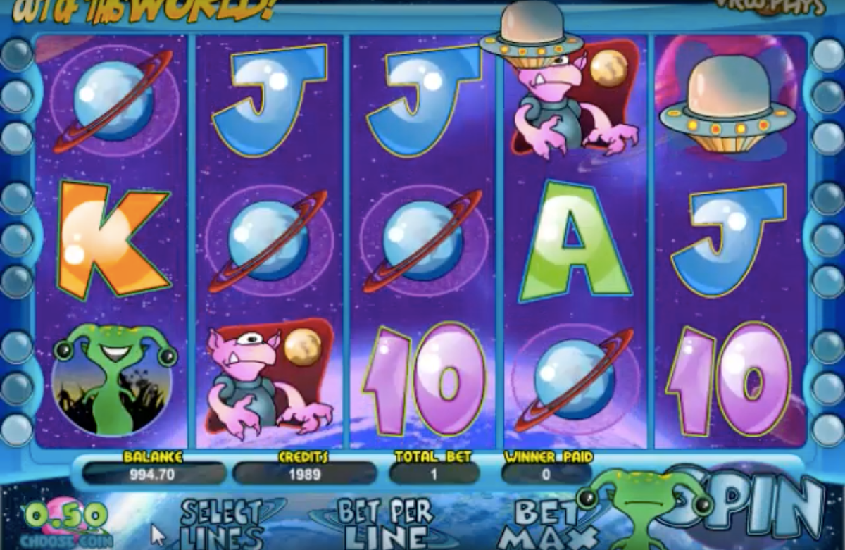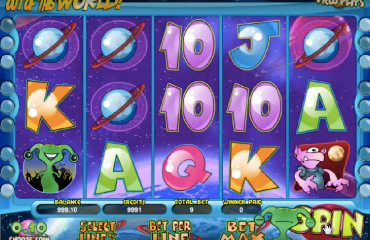 The Out Of This World Slot machine features five reels with 20 pay lines. BetSoft software powers this alien/paranormal themed video slot machine that played using your Internet browser, on a mobile smartphone or tablet. This game has plenty of ways to win but does not include progressive jackpots but it does have a 20,000-fixed coin jackpot.