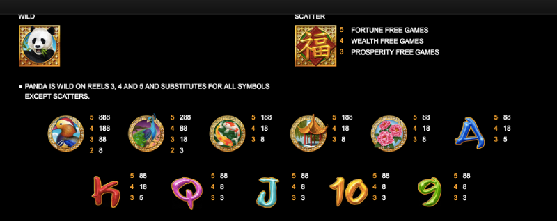 There is a Wealth Free Games round is triggered by four scatters. You’ll get eight free spins again, but any win earned with a panda wild has an 8x multiplier.