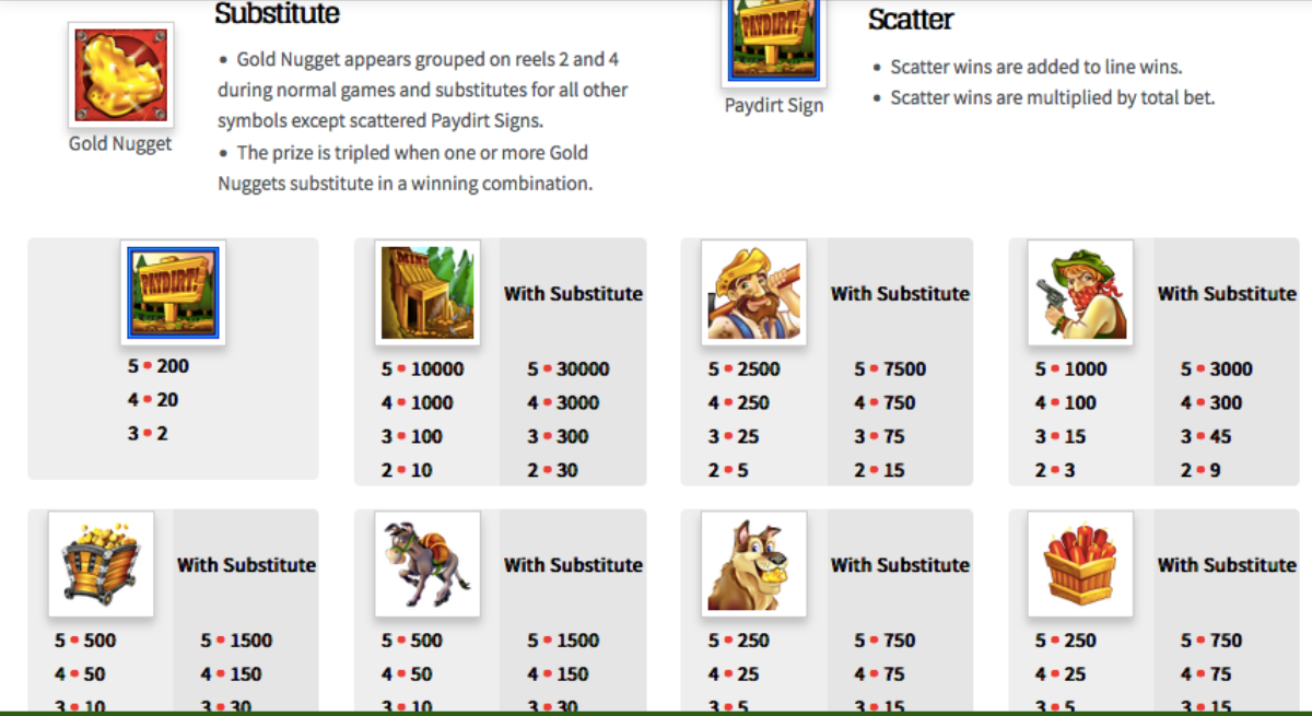 The Golden Nugget symbols are the wild icon in this game, and the PayDirt Sign is the scatter symbol. When you get a PayDirt scatter symbol on the reels, it will trigger a bonus game that offers free spins, and during the bonus game you wins are multiplied. If you land a Golden Nugget wild symbol on the reels, then the Golden Nugget image will replace all of the other icons except for the scatter icon to help you form a winning combination.