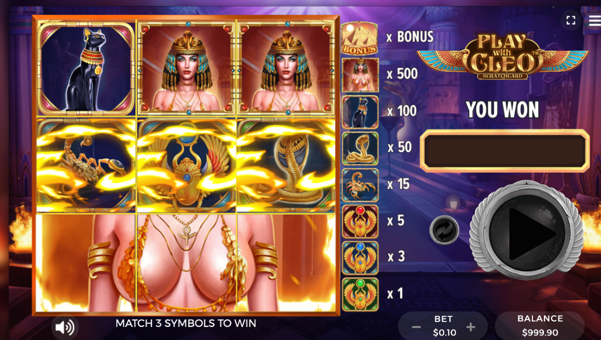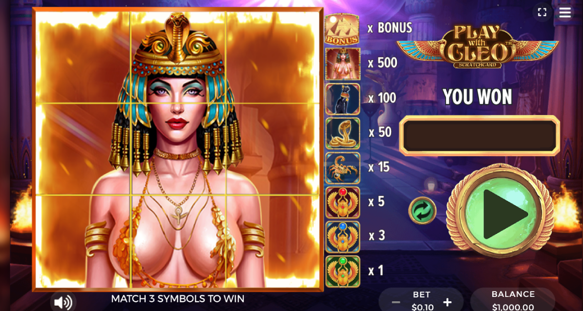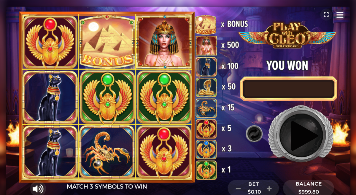 Scatters, on the other hand, appear in both Play with Cleo scratch card game and the Pyramids symbol of Play with Cleo scratch card game. When you’ve landed three Scatters at once, you’ll get ten free cards. Play your key card, add the Wheel of Fortune to your hand, and then use it to play through all these additional cards. The Wheel of Fortune will provide you a multiplier in addition to the free card wins.