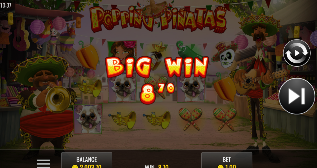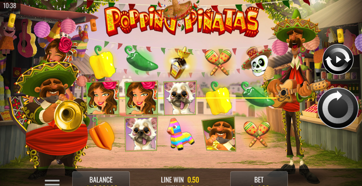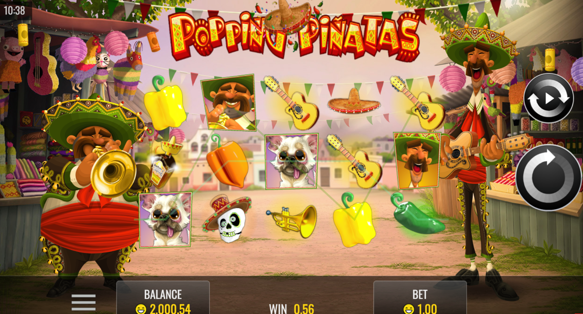 The unique feature is the Popping Pinata bonus symbol. More than three of them activate the bonus round, in which you must smash piñatas and take money rewards until you hit the empty one, and the fun continues in a base game mode.