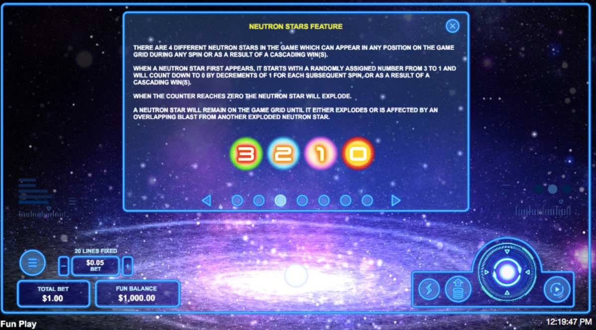Once you set your bet, keep your eyes peeled for the Neutron Star symbol. Ultimately, the Neutron Star triggers a bonus game at random. The Neutron Star is one of the most important symbols in the game plus there are different colored Neutron stars.