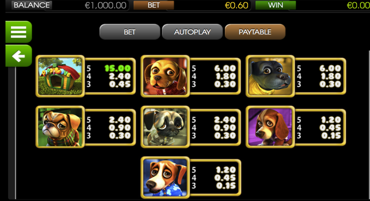 You will also see some very colorful cinematic three-dimensional dog bowls, toys, and a kennel, name tags and other symbols that are indicative of this animal/dog themed mobile slot game.