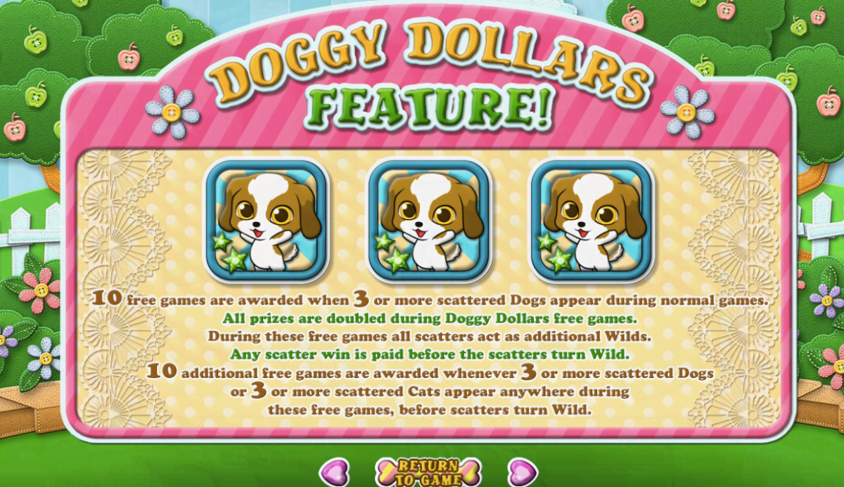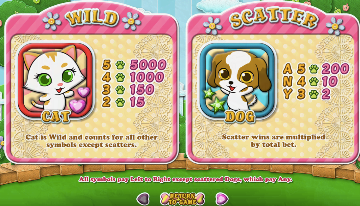 The cats are the wild in the game. Land the cat on the wheel, and it will replace the other icons to help you put together a winning combination. Triple all of your prizes when you land a cat, but the only symbol will not replace the scattered dogs. The scattered dog awards double prizes for ten free games. During your free spins, the dog will act as the additional cat Wilds symbols.
