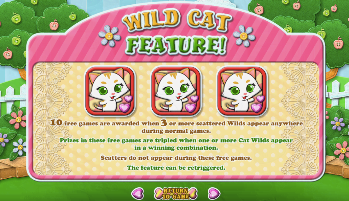 When you first open, again you will see a cat and dog. Under the cat, you will see ten free games with three Wildcats. Under the dog, you will see ten free games with three scattered dogs. Below that you will see a random feature that triggers at the end of regular gameplay. Click on the continue button to start playing the electronic gambling machine.