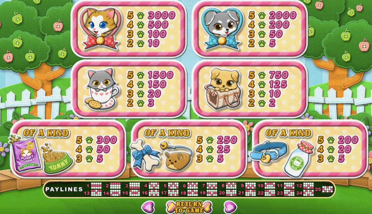 Cats and dogs make perfect pets. Some folks like other animals like birds but most people have a dog, cat or both. They are easily trained in most cases, make excellent friends, and are a part of the family. The Purrfect Pets slot machine as five reels with 25 pay lines. Real time gaming software released this video slot machine in May 2017. Are you ready to enjoy two progressive jackpots with a 30,000X multiplier?