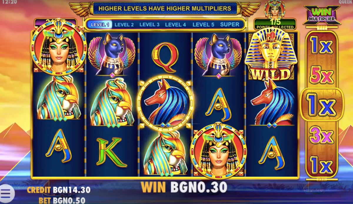 The Pharaoh icon is the wild symbol in Queen of Gold. When you land one or more of the Pharaoh wild symbols, it will substitute for all the other symbols and help you form a winning combination for yourself.