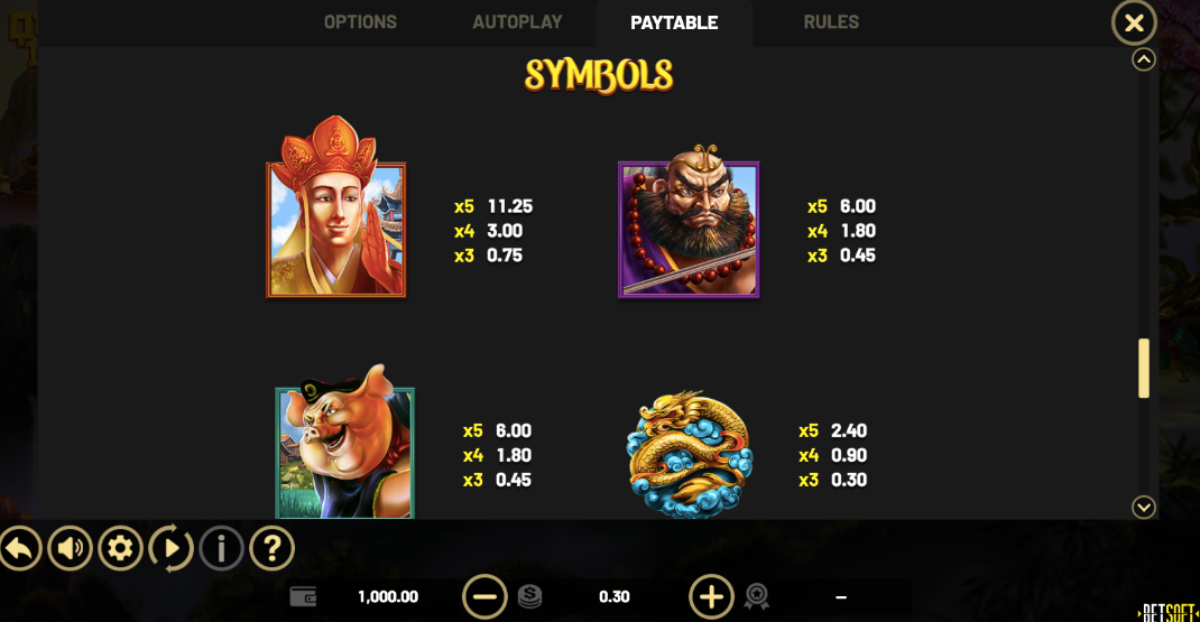 As you are playing the Quest For The West slots, keep your eyes peeled for the Monkey King. Furthermore, the Monkey King is the wild symbol. If you get lucky enough to score three or more of the wild symbols, you will trigger the Quest to the West bonus feature. Moreover, everytime the Monkey King symbol walks away from the reels to the West, he tries to fill the Meter of the Heavens by a level.