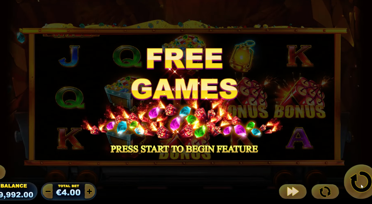 If 3 dynamite sticks show up, you get 10 free spins. If you win when the dynamite is there, it will blow up and give you money. A special line will be highlighted each spin. If a diamond is behind the dynamite, it will give you more spins and move to the next stage.